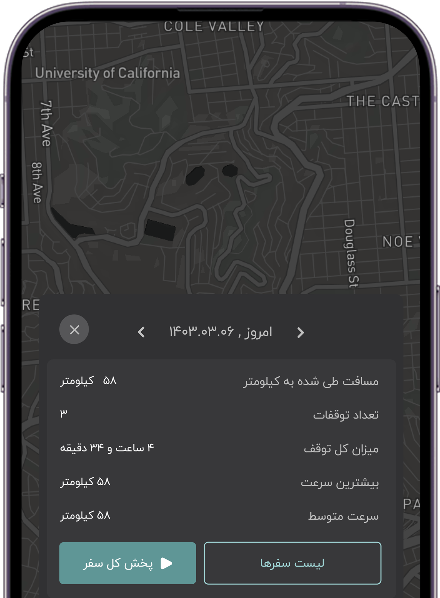 میتوانید سابقه موقعیت خودرو را طی یک روز گذشته یا در بازه زمانی دلخواه به صورت یک انیمیشن با سرعت دلخواه مشاهده کنید.